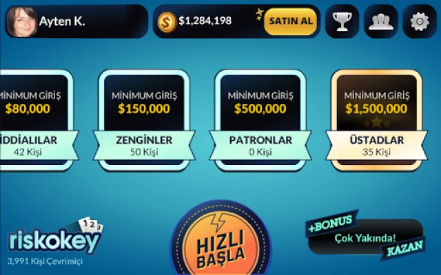 Представете си игра, която преобръща традиционното разбиране за окей, издигайки го до нови върхове на вълнение и предизвикателство. "Risk Okey" е създадена за истинските майстори, които търсят динамични и бързи партии, където всяко решение носи тежест. Забравете ограниченията – тук можете да се потопите в игра с толкова участници, колкото желаете, без да сте обвързани с фиксиран брой от четирима. Тази гъвкавост ви позволява да създавате уникални преживявания и да се наслаждавате на безкрайни стратегии.