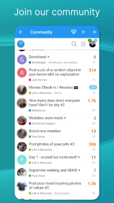 Няма нужда да се справяте сами. С Sober Time получавате достъп до жизнена и подкрепяща общност от хора, които разбират през какво преминавате. Споделяйте истории, задавайте въпроси и черпете мъдрост от членове с дългогодишен опит в трезвеността. От дискусии за справяне с алкохолна или наркотична зависимост, до теми като самонараняване – общността е безопасно пространство за подкрепа и насърчение. Тази мрежа от връзки е винаги до вас, предлагайки човешка топлина и ценни съвети, когато физически срещи не са възможни.