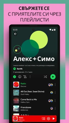Слушайте любимата си музика и подкасти безплатно, където и да се намирате – на вашия мобилен телефон или таблет. Spotify ви дава свободата да избирате измежду милиони песни, да изследвате подбрани плейлисти, създадени за всяко настроение и дейност, или да създавате и споделяте свои собствени. Пуснете произволен изпълнител, албум или песен и се насладете на интуитивно и приятно слушане. Открийте идеалния саундтрак за сутрешното си кафе, тренировката във фитнеса или релаксиращата вечер у дома – всичко това е достъпно на широк спектър от устройства, включително компютри, PlayStation, Chromecast и смарт телевизори.