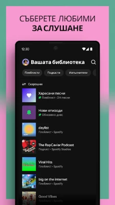 Представете си свят, в който всяка песен, всеки подкаст и всеки албум са на една ръка разстояние, готови да бъдат открити и слушани. Spotify преобразява начина, по който взаимодействате с музиката и аудио съдържанието, предлагайки безкраен поток от нови и любими изпълнения. Независимо дали търсите най-новия хит, задълбочен подкаст или вечна класика, Spotify е вашият личен аудио гид, който ви помага да намерите точно това, което търсите, и много повече. Открийте нови музикални вселени и потопете се в персонализирани аудио преживявания, създадени специално за вас.