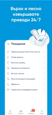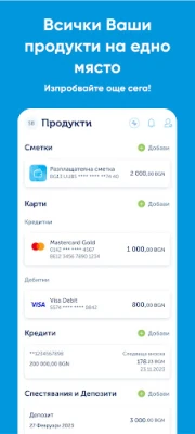 Управлявайте безпроблемно Вашите сметки и карти. Проследявайте в реално време движенията и наличностите по сметките си, с опция за известия при всяка транзакция. Филтрирайте операциите по зададени от Вас критерии и споделяйте IBAN с едно докосване. Дигиталният асистент Кейт е винаги на линия, за да Ви помогне да анализирате разходите си за изминалия месец. Блокирайте или активирайте картите си моментално, получавайте известия за покупки и ги добавяйте лесно към Google Pay или Apple Pay. Извършвайте всякакви преводи – между собствени сметки, незабавни в лева към трети страни, валутни или бюджетни. Забравете за дългите опашки – плащайте битовите си сметки бързо, създавайте шаблони за повтарящи се плащания и сканирайте IBAN с камера. Осигурете си спокойствие при онлайн пазаруване с 3D Secure и биометрично потвърждаване.