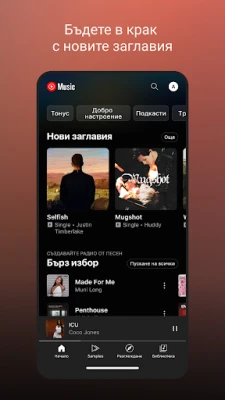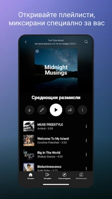 YouTube Music е вашата връзка със света на музиката. Открийте уникално съдържание като изпълнения на живо, кавъри, ремикси и музика, която не намирате другаде. Насладете се на хиляди подбрани плейлисти в различни жанрове и за дейности. Слушайте персонализирани миксове, създадени специално за вас. Създавайте плейлисти, сътрудничете с други и следете актуалните тенденции. Изградете своята лична фонотека.