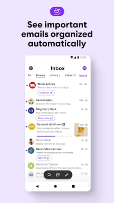 Защитете своето дигитално пространство и останете информирани без усилие. Yahoo Mail гарантира спокойствието ви с модерни функции за сигурност, които проактивно ви предупреждават за подозрителни имейли и потенциални заплахи. Но това не е всичко – следете пратките си и намирайте касови бележки за покупки директно от върха на входящата си кутия. Всички подробности за поръчките и скорошни придобивки са удобно събрани на едно място. Управлявайте цялата си електронна поща от едно централизирано приложение, свързвайки безпроблемно акаунтите си в Gmail, Outlook, AOL и Hotmail, за да имате пълен контрол върху всичките си комуникации.